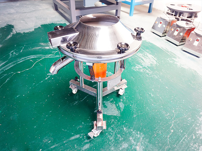 450過(guò)濾篩——直徑為450mm,由電機(jī)驅(qū)動(dòng)重錘激振,篩體產(chǎn)生水平、垂直、傾斜的三次元運(yùn)動(dòng),使含水物料在篩網(wǎng)上被拋起并由中央向外旋轉(zhuǎn)擴(kuò)散到出料口排出,含水物料在篩網(wǎng)上面的運(yùn)動(dòng)中,細(xì)小顆粒或液體透過(guò)篩網(wǎng),通過(guò)選擇安裝相應(yīng)的篩網(wǎng)和篩網(wǎng)層數(shù)使物料完成篩選分級(jí)或過(guò)濾,分選出的物料由各自的出料口分別自動(dòng)排出。是一臺(tái)單層篩分和過(guò)濾使用的振動(dòng)篩,被各個(gè)廠(chǎng)家和用戶(hù)叫做液體專(zhuān)用振動(dòng)篩,因?yàn)闄C(jī)身小的原因,所以它的處理量不多,適用于小產(chǎn)能要求。