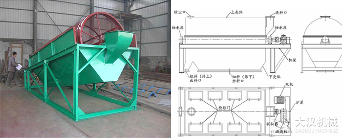 電機驅動滾筒軸線作旋轉運動,減速機調節筒體以一定的轉速旋轉,物料由進料口進入筒體內,在旋轉產生的離心力作用下,物料在筒內翻滾,自上而下通過分級篩網析出,由于篩網分級尺寸不同,物料逐漸被分離篩選,粒度合格的物料經篩分后落入到各自的漏斗,然后由人力方式運出或通過輸送機自流送往成品站。合格產品經過下端出料口排出,顆粒較大,分選不合格的產品經另一排料口排出,筒內清理裝置,使篩網不宜被阻塞。