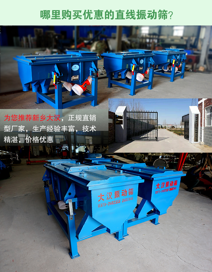 現(xiàn)提前預(yù)約,即可享受新折扣價(jià),您也可來廠對(duì)直線振動(dòng)篩進(jìn)行免費(fèi)的參觀與試機(jī),了解實(shí)際生產(chǎn)現(xiàn)場(chǎng)的運(yùn)行情況,大漢公司隨時(shí)期待著您的到來。