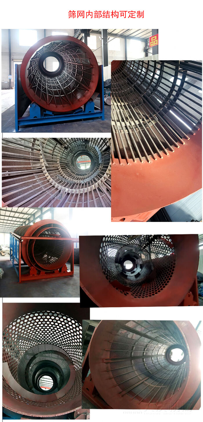 重型滾筒篩針對于含有一定水份的物料篩分,防止濕物料篩分時產生堵網,重型滾筒篩能夠客服各種種振動篩在篩分較濕物料時出現的篩網粘堵問題,提高篩分系統的產量和可靠性。