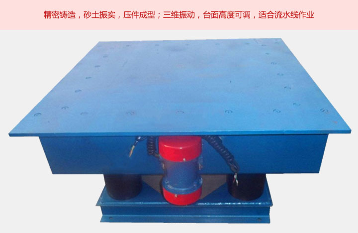 鑄造用振動(dòng)平臺(tái)采用橡膠彈簧和6臺(tái)-8臺(tái)振動(dòng)電機(jī)組合,具有上下,左右前后的三維振實(shí)效果,它具有多結(jié)構(gòu)支撐,結(jié)構(gòu)牢固,密封性好,性能可靠,操作簡單,振動(dòng)頻率可調(diào)等特點(diǎn)。