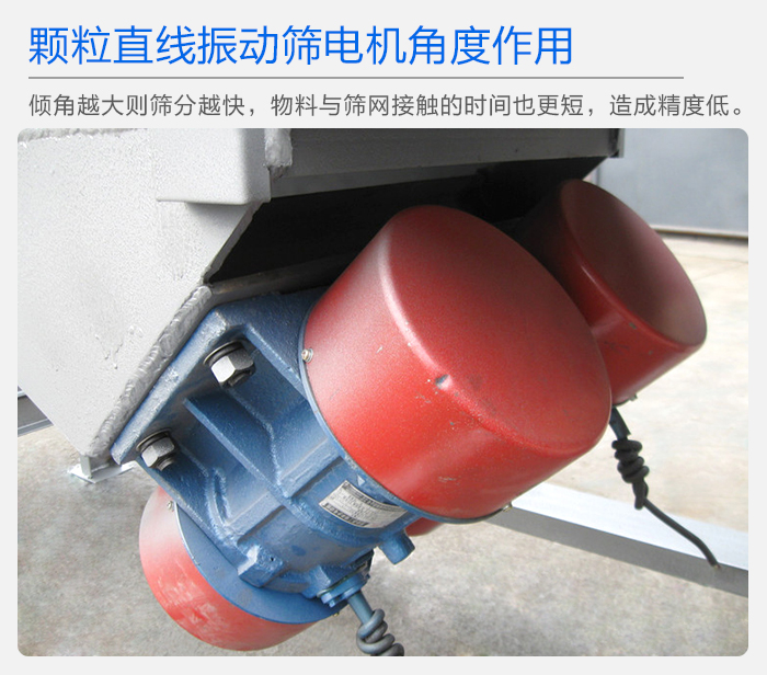 顆粒直線振動篩電機的安裝角度是可以調整的,角度不一樣,其產生的振幅大小也不一樣,一定傾角的直線振動篩,可以有效的提高篩分產量,增大生產效率,傾角越大,則篩分越快,物料與篩網接觸的時間也更短,則篩網使用年限也會增加,角度過大。則容易造成篩分精度達不到,影響篩分質量,所以顆粒直線振動篩的振動電機在安裝時,角度的選取很重要,客戶在開機使用直線振動篩前,應根據生產需求,調整好角度,一般直線振動篩廠家在篩機出廠前,將其角度調整為45度。