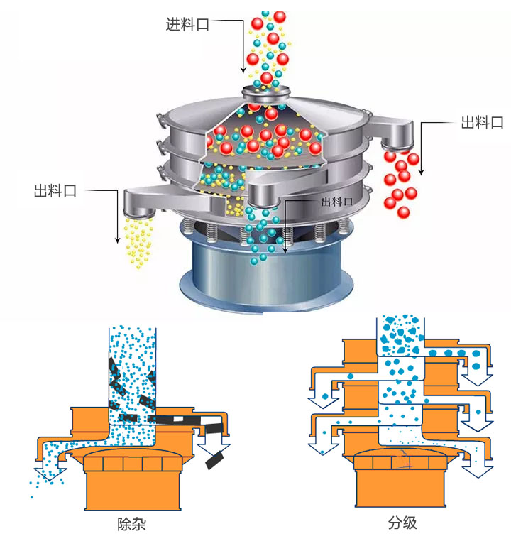 將速凍玉米倒入篩機中,在振動電機的作用下,速凍玉米在篩面上由中間向四周擴散,期間,速凍玉米根據粒度通過篩網,大于篩網尺寸的速凍玉米將停留在篩面上并從出料口排出,小于篩孔的速凍玉米將進入下層篩網繼續篩分,直至被排出。